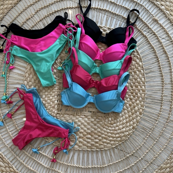 Ideal para quem busca um biquíni que combine estilo, conforto e ajuste perfeito, seja para relaxar na praia, curtir a piscina ou arrasar em resorts. O toque sofisticado das amarrações e pingentes dourados traz um charme adicional ao look de verão.