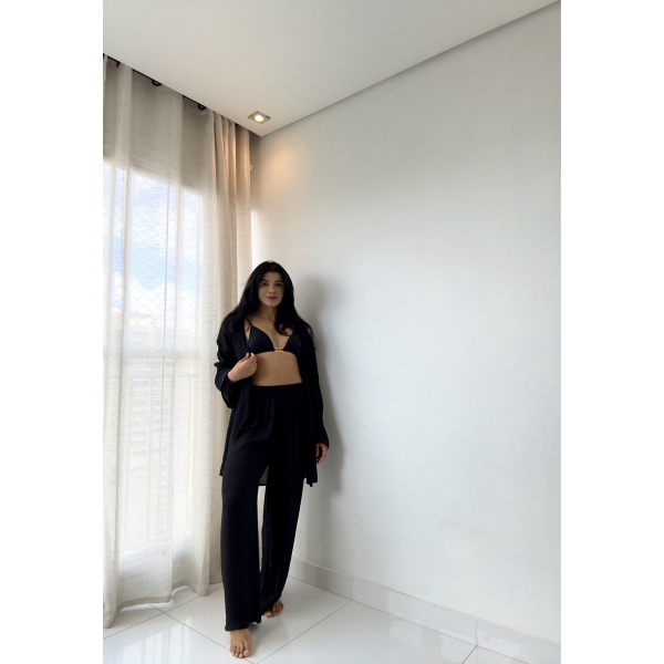 Informações do produto: Blusa E Calça Em Tecido Leve Saída De Praia Lisa - Preto