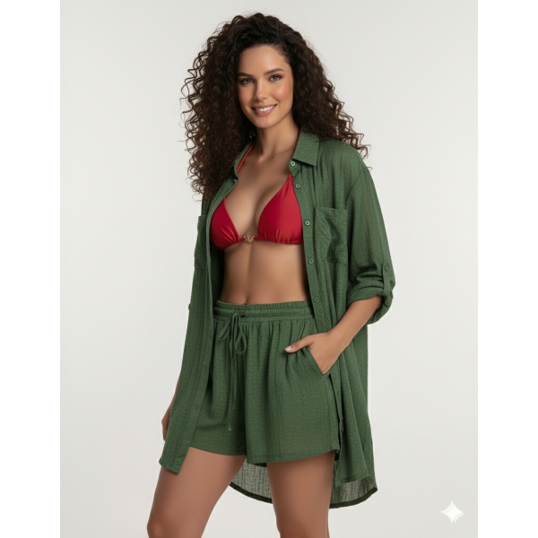 Informações do produto: Conjunto Saída De Praia Viscolinho Blusa Manga Longa + Sh - Verde-escuro
