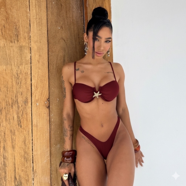 Este conjunto exclusivo de biquíni com saia traz sofisticação e elegância para os seus dias de verão. Com um design moderno e charmoso, o destaque do conjunto é o detalhe dourado em forma de estrela que agrega um toque especial à peça. Ideal para momentos de lazer na praia ou piscina, o biquíni tem ajuste confortável e a saia proporciona uma cobertura adicional, mantendo o estilo.