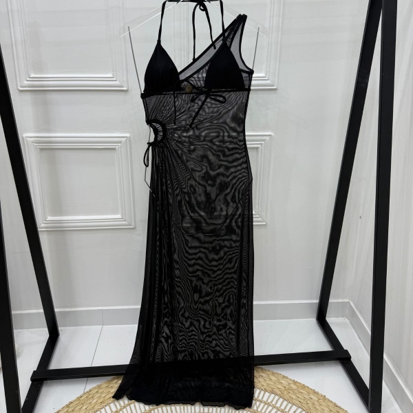 Informações do produto: Kit Biquíni Com Saída Longa Assimétrica Em Tule Transparente - Preto