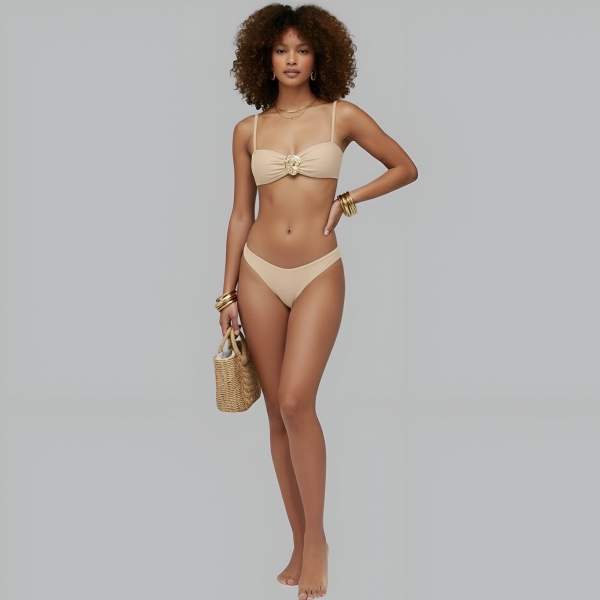 Design Sofisticado e Detalhes Exclusivos: O biquíni, com seu design clássico e modelagem impecável, oferece suporte e realça a silhueta de forma natural. O destaque fica por conta do adorno dourado em formato de concha, que confere um toque de luxo e exclusividade à peça, tanto no top do biquíni quanto na saída de praia.