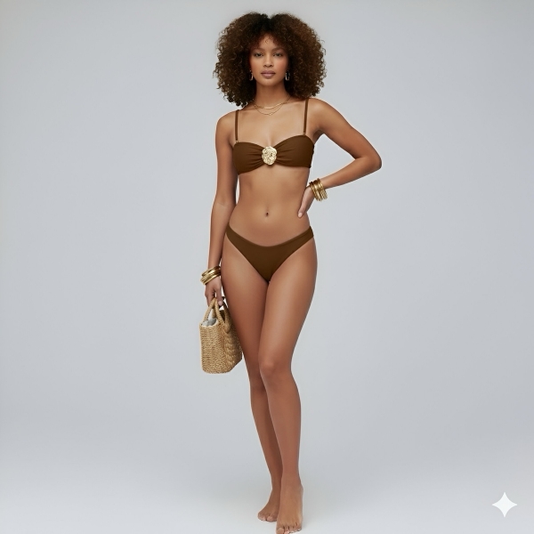 Design Sofisticado e Detalhes Exclusivos: O biquíni, com seu design clássico e modelagem impecável, oferece suporte e realça a silhueta de forma natural. O destaque fica por conta do adorno dourado em formato de concha, que confere um toque de luxo e exclusividade à peça, tanto no top do biquíni quanto na saída de praia.