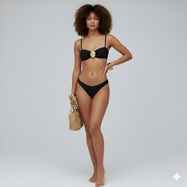 Design Sofisticado e Detalhes Exclusivos: O biquíni, com seu design clássico e modelagem impecável, oferece suporte e realça a silhueta de forma natural. O destaque fica por conta do adorno dourado em formato de concha, que confere um toque de luxo e exclusividade à peça, tanto no top do biquíni quanto na saída de praia.