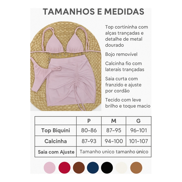 A saia é tamanho único com boa elasticidade. O biquíni está disponível nos tamanhos P, M e G.