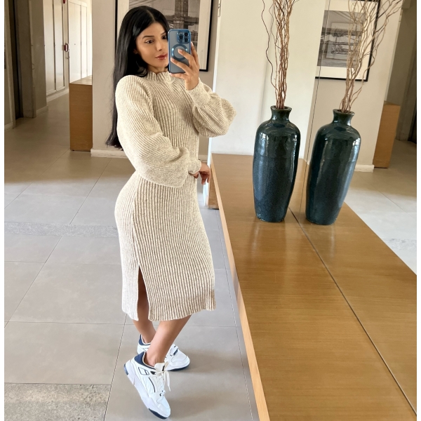 Informações do produto: Vestido De Tricot Graça Canelado Midi Com Fendas - Areia